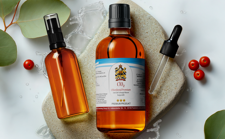 Premium product lineup with pipette and spray bottle, medical-grade look, and bold German origin icon