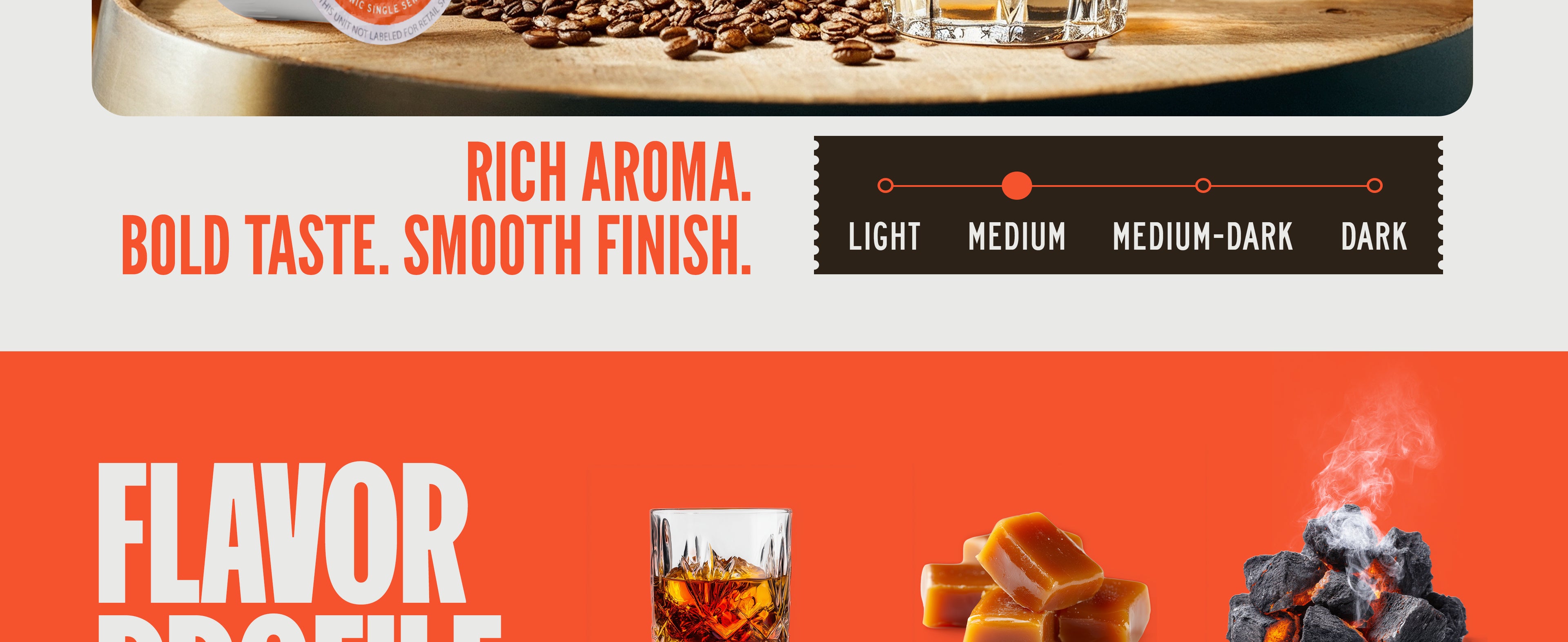 Quality Proof: Direct reference to Small Batch Roasting and complex flavor notes (Oak, Caramel, Smoke) to justify premium status.